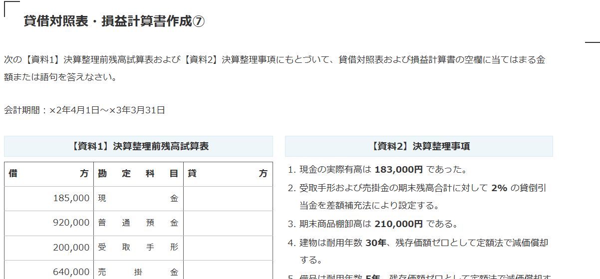 次の【資料1】決算整理前残高試算表および【資料2】決算整理事項にもとづいて、貸借対照表および損益計算書の空欄に当てはまる金額または語句を答えなさい。