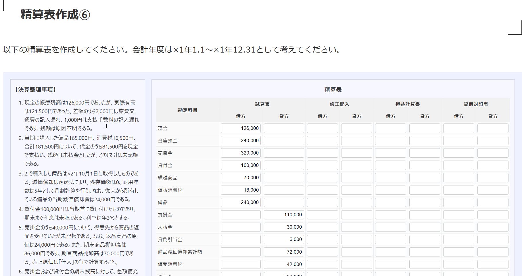 精算表作成⑥ 2026.03.22 以下の精算表を作成してください。会計年度は×1年1.1~×1年12.31として考えてください。 【決算整理事項】 精算表 勘定科目 試算表 修正記入 損益計算書 貸借対照表 借方貸方 借方貸方 借方貸方 借方貸方